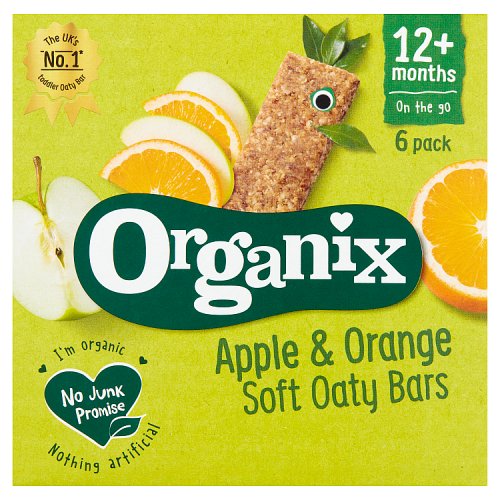 Organix 12 Month Apple & Orange Bars are deliciously soft and oaty organic apple and orange bars, made with a blend of organic wholegrain oats, raisins, apple juice and orange oil.