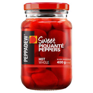 Peppadew Hot Peppers are small, whole peppers. They have a spicy kick to them and taste delicious chopped and mixed into salads.